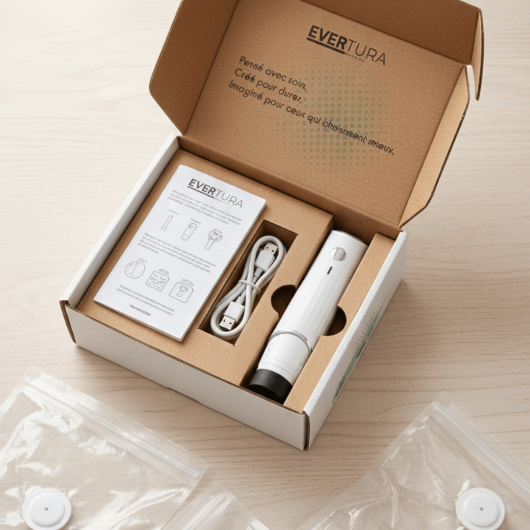 Med Evertura holder dine madvarer sig friske op til 5 gange længere end ved traditionel opbevaring. Vakuumteknologien fjerner luften, hvilket bevarer både smag, tekstur og vigtige vitaminer. For eksempel kan kød i fryseren holde sig i årevis uden at få frostskader, og grøntsager i køleskabet forbliver sprøde i flere uger.
